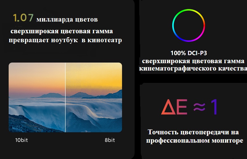 Ноутбук оснащен дисплеем нового поколения E4. Цветовая гамма дисплея включает около 1.07 миллиарда ярких цветов, от нежных и тонких оттенков, до шокирующих глаз ярких красок. Xiaomi Notebook Pro 15 усилен эксклюзивной технологией калибровки цвета ICC, OLED-дисплей поднят на новый уровень профессионализма.