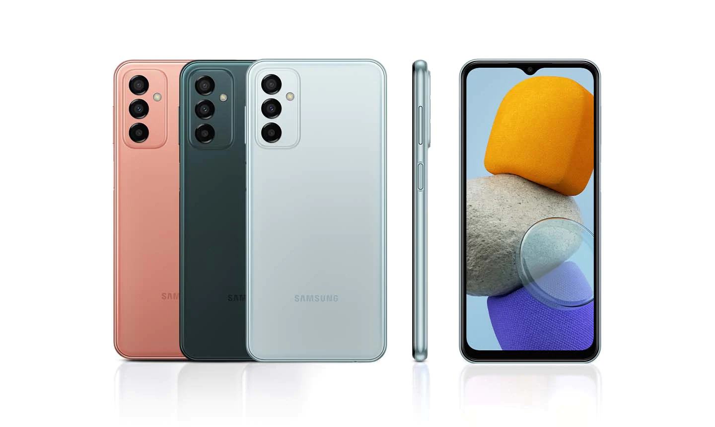 Galaxy M23 5G відрізняється якісним дизайном з м'якими закругленими краями та простою центральною рамкою, в якій розміщується мінімалістична камера. M23 5G представлений у блакитному, темно-зеленому та оранжево-мідному кольорах, тому ви можете вибрати варіант, що підходить до вашого повсякденного стилю.