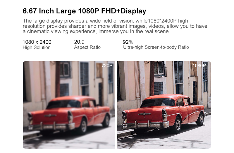 Большой дисплей обеспечивает широкое поле зрения. В то время как Высокое разрешение 1080*2400P обеспечивает более четкие и яркие изображения, видео, позволяют вам наслаждаться кинематографическим просмотром и погрузить вас в реальную сцену.