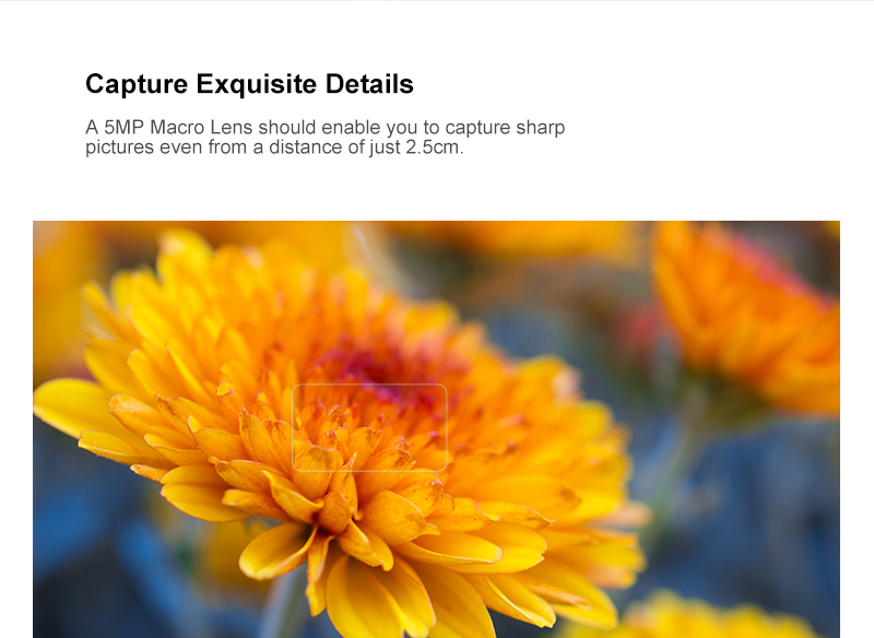 Макрообъектив 5 Мп позволит снимать резкие снимки даже с расстояния 2,5 см.