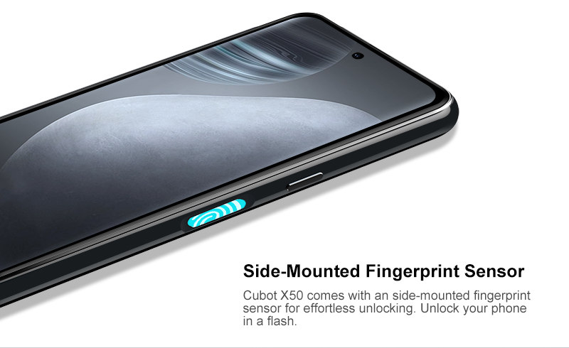 Cubot X50 поставляется с боковым датчиком отпечатков пальцев для легкой разблокировки. Разблокируйте телефон вспышкой