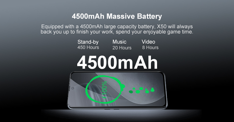 Оснащенный батареей большой емкости 4500 мАч, X50 всегда будет поддерживать вас в запасе, чтобы закончить работу, провести приятное время в игре.