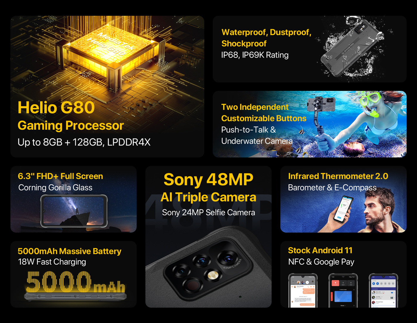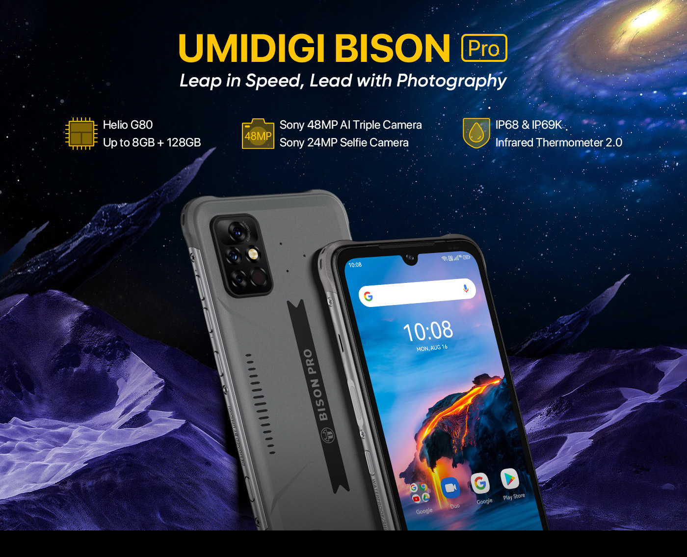 UMIDIGI Bison Pro - защищенный смартфон, изготовленный в корпусе из прочного пластика и металла. Он способен выдерживать внешнее воздействие по стандартам IP69K, IP68 и MIL-STD-810. Практически всю лицевую поверхность UMIDIGI Bison Pro занимает 6,3-дюймовый IPS дисплей с разрешением 2340х1080 точек. Высокую скорость работы в повседневных задачах обеспечивает 8-ядерный процессор MediaTek Helio G80, дополненный графическим ускорителем Mali-G52. Основная камера смартфона получила три модуля на 48, 16 и 5 МП. Фронтальная на 24 размещена в небольшом каплевидном вырезе дисплея. Дополнительно UMIDIGI Bison Pro имеет встроенный NFC и функцию быстрой зарядки.